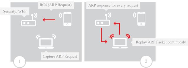 测试场景从一个使用 WEP 协议进行加密的 WiFi 接入点和一台知道其密钥的离线客户端设备开始 —— 为了测试方便,密钥使用了 12345,但它可以是更长且更复杂的密钥。一旦客户端连接到了 WEP 接入点,它会发送一个不必要的 ARP 数据包;这是要捕获和重放的数据包。一旦被捕获的包含 IVs 的数据包数量达到了设置的上限,测试就结束了。