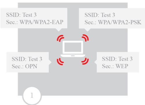 图 4 中的场景使用相同的 SSID 创建了多个接入点,对于那些可以探测到但是无法接入的 WiFi 网络,这个技术可以发现网络的加密类型。通过启动具有所有安全设置的多个接入点,客户端会自动连接和本地缓存的接入点信息相匹配的接入点。