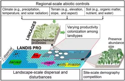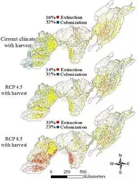 中国科学院东北地理与农业生态研究所景观生态过程学科组研究人员结合森林调查数据、土地利用数据、土壤数据及气候变化预测数据,利用森林景观过程模型(LANDIS PRO)和生态系统过程模型(LINKAGES)预测了30个树种在未来300年内的分布变化,明确树种分布在未来的变化规律,量化了种群动态过程、森林采伐、气候变化及其交互作用的相对重要性以及影响树种分布变化的重要的生物属性。