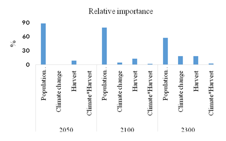图3. 种群动态、采伐、气候变化及其交互作用对树种(以white oak 为例)分布变化的相对贡献