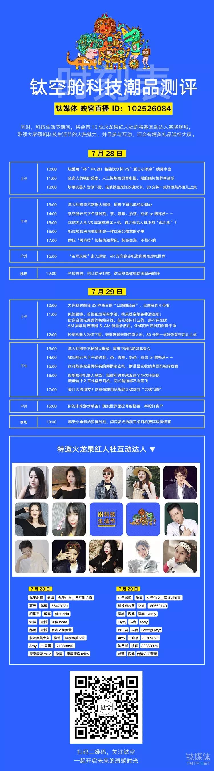 钛空舱作为未来科技生活方式选品、荐品平台将在现场和特邀互动达人快闪平台火龙果红人社的13位互动达人一起,带来“见所未见”、“科技两面派”两大亮点直播环节,带领大家领略活动的独特魅力,并且也有精彩互动礼品送给大家哦!(没错,就是下面这些小哥哥和小姐姐~)