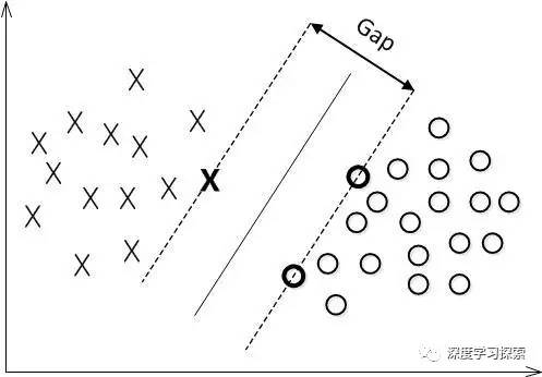 对一个数据点进行分类,当超平面离数据点的“间隔”越大,分类的确信度(confidence)也越大。所以,为了使得分类的确信度尽量高,需要让所选择的超平面能够最大化这个“间隔”值。这个间隔就是下图中的Gap的一半。