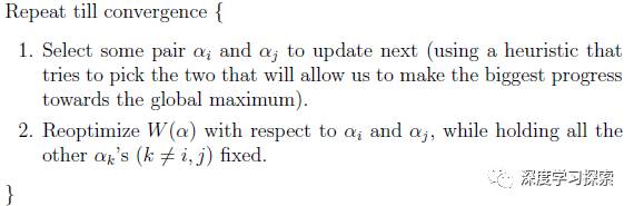 综上,SMO算法的基本思想是将Vapnik在1982年提出的Chunking方法推到极致,SMO算法每次迭代只选出两个分量ai和aj进行调整,其它分量则保持固定不变,在得到解ai和aj之后,再用ai和aj改进其它分量。与通常的分解算法比较,尽管它可能需要更多的迭代次数,但每次迭代的计算量比较小,所以该算法表现出较好的快速收敛性,且不需要存储核矩阵,也没有矩阵运算。