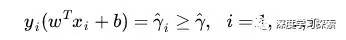 而超平面(w,b)关于T中所有样本点(xi,yi)的函数间隔最小值(其中,x是特征,y是结果标签,i表示第i个样本),便为超平面(w, b)关于训练数据集T的函数间隔: