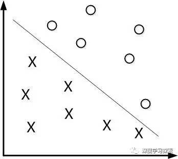 下面举个简单的例子。如下图所示,现在有一个二维平面,平面上有两种不同的数据,分别用圈和叉表示。由于这些数据是线性可分的,所以可以用一条直线将这两类数据分开,这条直线就相当于一个超平面,超平面一边的数据点所对应的y全是-1 ,另一边所对应的y全是1。