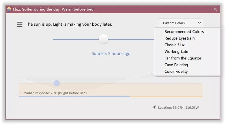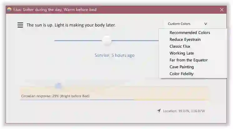 f.lux 是一款屏幕色温调节工具,它可以随着你所在地,智能地帮助帮你调节屏幕色温。