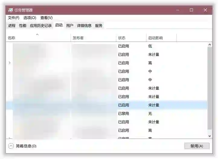 一是打开任务管理器,切换至启动标签页,页面列出了随系统启动的应用名称、发布者、状态、启动影响,使用鼠标右键可禁用应用程序,从启动项删除。
