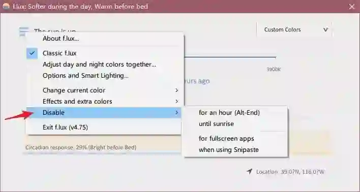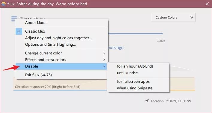f.lux 针对白天、日落和休息三个不同的时间段提供不同的色温方案。如果用户担心 f.lux 影响视频和修图等应用,那么可以使用 Disable 这个类似白名单的菜单选项,让 f.lux 暂时失效,屏幕恢复到正常色温。