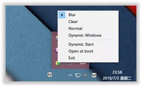打开 TranslucentTB 主程序后会在桌面右下角托盘区显示对应的应用图标,使用右键查看菜单选项,软件提供了多个样式的显示效果。