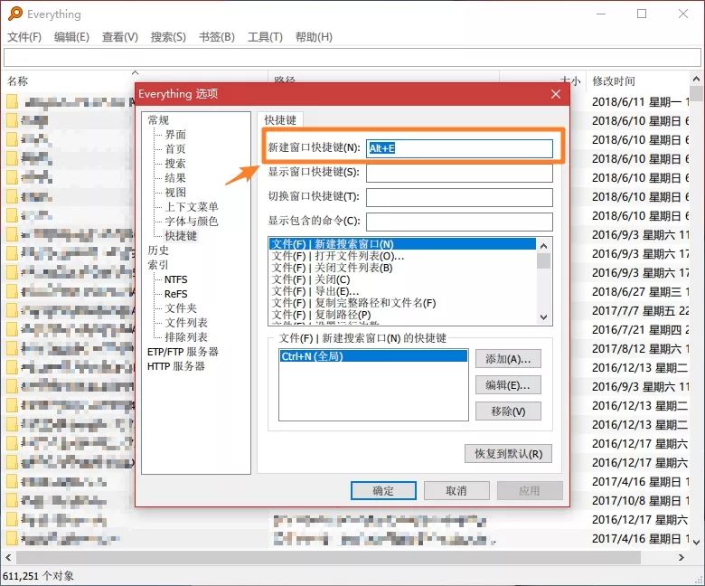 当然,我们也可以在 Everthing 的选项设置页面中,为「新建窗口快捷键」设置全局形式组合快捷键。