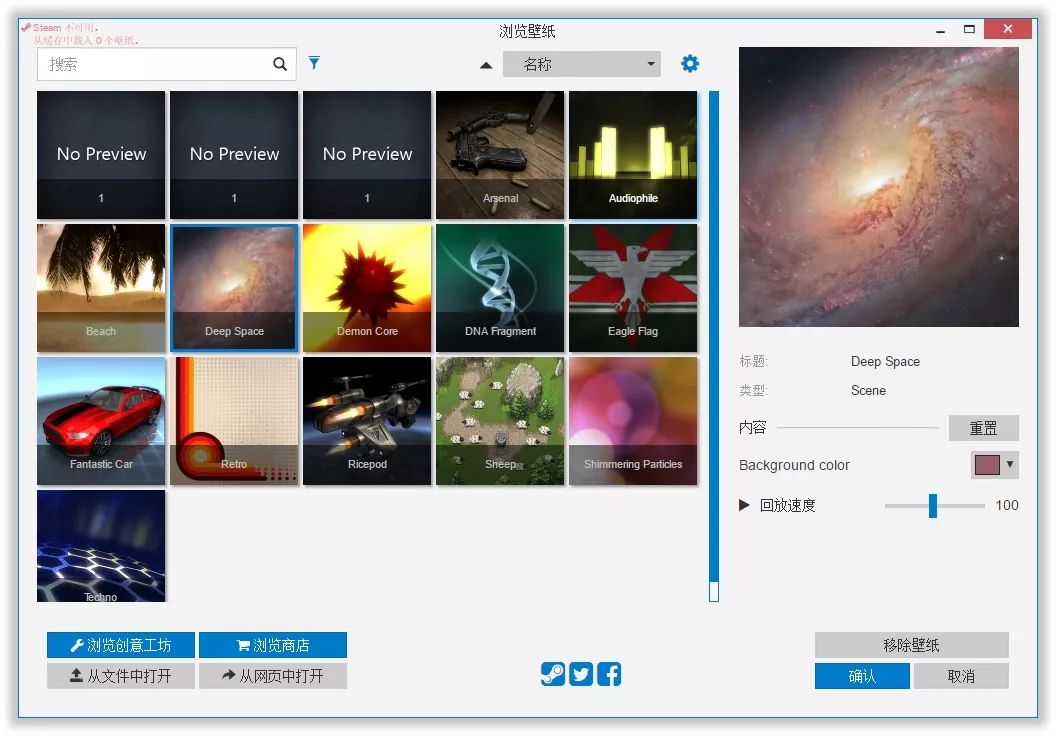 Wallpaper Engine 内置了几张壁纸,如果不喜欢的话还可以通过软件界面右下角「浏览创意工坊 」的入口,将自动打开 Steam 应用,访问大量精美的壁纸。另外 Wallpaper Engine 还支持自制壁纸。