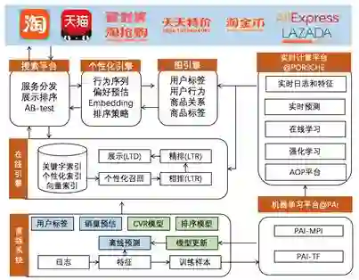 如上所示,经过多年的发展,搜索和推荐作为阿里电商两个最大的自然流量入口,已经All in AI,并形成了完整的用户偏好在线学习,流量的精细化匹配,以及基于强化学习等智能决策能力的购物决策体系。