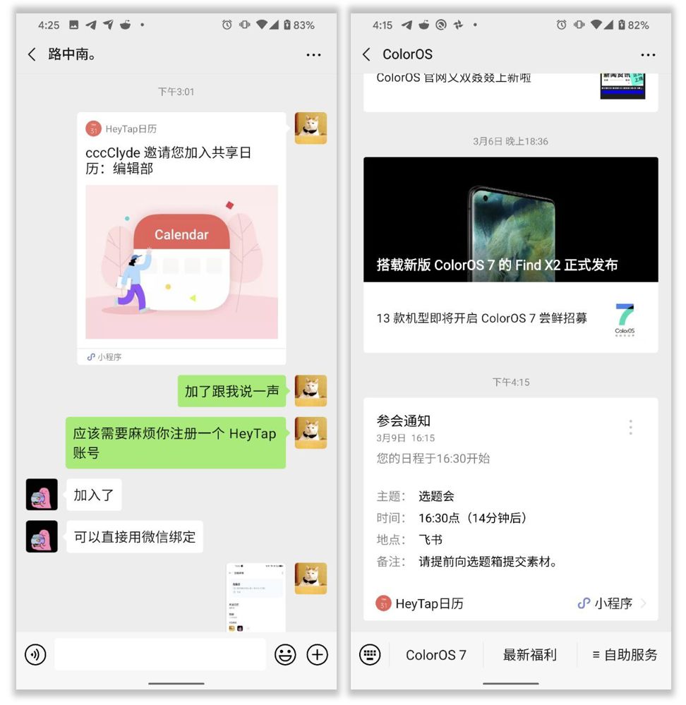同时,新版日历也通过与微信、系统邮件应用的整合获得了轻量化的日程协同能力:新建日历事项后,我们可以直接通过微信向同事发出日程邀请,被邀请人可通过 HeyTap 日历小程序加入到日程事件当中,同时通过微信收到日程相关的邀约和提醒。