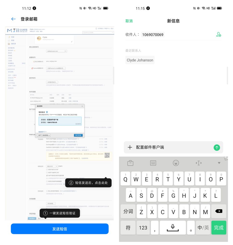 而这次 ColorOS 7.1 的内置邮件应用针对这个问题做了一点自动化优化,检测到要添加的邮箱账号是 QQ 邮箱时,邮件客户端会提供一键跳转至 QQ 邮箱登录和授权码获取页面的入口,进入授权码获取页面后,不仅会在屏幕上给出相应的操作提示,还支持一键调用系统短信应用发送验证短信,省去了应用间跳转和短信编辑的繁琐流程。