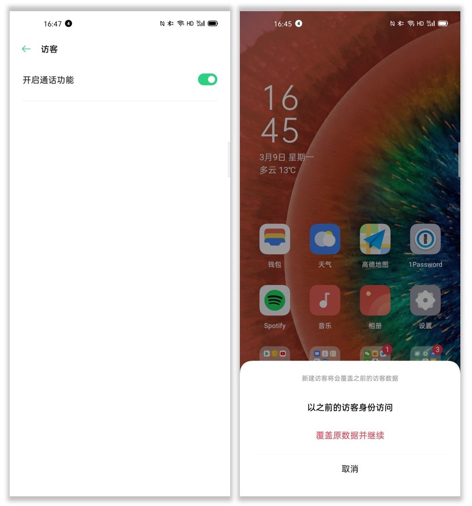 这里还有一些非常有意思的小细节:如果你把手机借给别人打电话,则还需在多用户设置中为访客账户开启通话功能;当我们第二次切换到「访客」账户时,系统则会提示我们是否清除上次登录的访客数据。