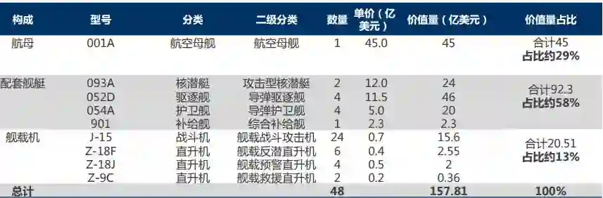 航母编队作为一项庞大的系统工程,涉及到航母、舰载机、配套舰艇等作战单元,市场蛋糕巨大。