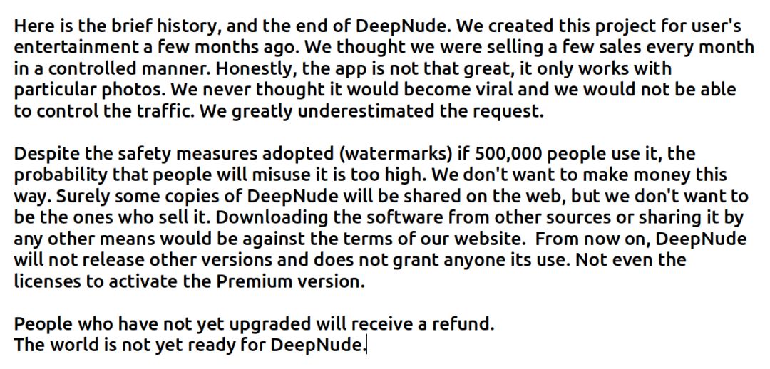 DeepNude 团队在宣布下架该 APP 的公告结尾称「这个世界还没有做好接受 DeepNude 的准备,总有一天,这款 APP 可以得到适当的用。」
