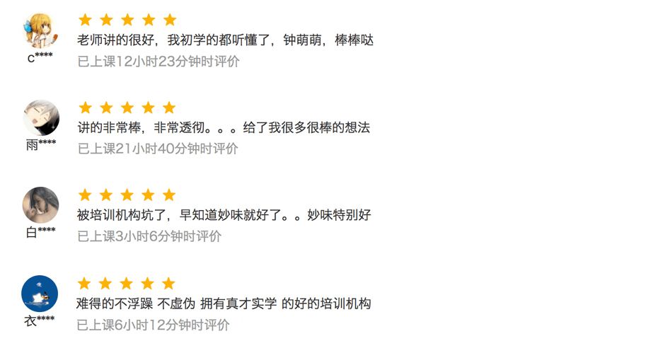 导师经验丰富:团队均来自大厂,风趣幽默,透彻深入,小白也能听得懂;