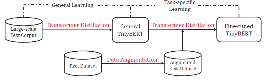 训练时提出了两阶段蒸馏框架,通用模型蒸馏和任务相关蒸馏。通用模型蒸馏使用大规模通用语料进行蒸馏训练,这一阶段的蒸馏不包括预测层 logits 的蒸馏。进行任务蒸馏时,先对任务数据集进行数据增强,然后进行蒸馏,此时的 teacher 是 BERT 在改任务的微调模型。