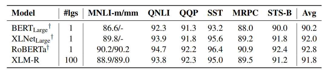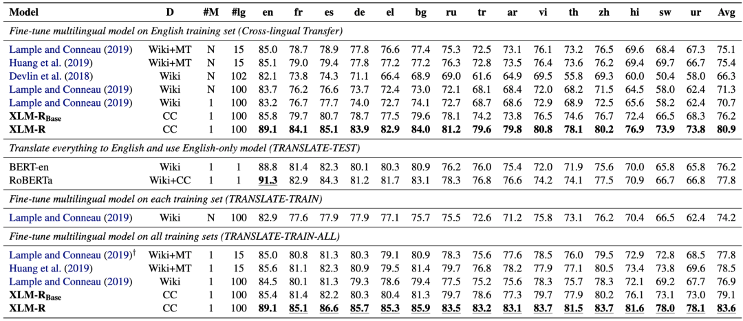 XLMR 也在 XNLI 上进行的试验评测,如下图所示: