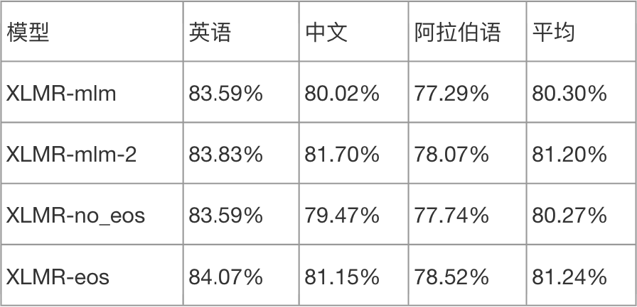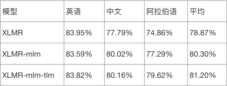 TLM 任务需要使用平行语料,但是我们没有,于是我们尝试使用其他语种文本的机器翻译作为平行文本,构造平行文本对训练数据。我们采用 MLM+TLM 任务进行二次训练,下表是实验对比,加入 TLM 任务后英语和中文没有明显提升,阿拉伯语提升明显。说明 TLM 任务确实带来了一定的提升。但是在后续的知识蒸馏时,加入 TLM 任务的模型蒸馏效果较差,所以后续没有使用 TLM 任务。