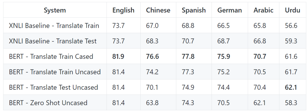 M-BERT 在 XNLI 数据集上进行评测( MultiNLI 的多语言版本),下面是其实验结果: