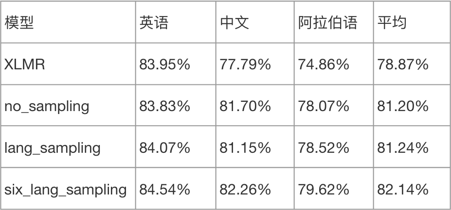 实验结果如下表所示。因为小语种数量很少,所以所有语言参与采样(lang_sampling)会将大语种数据“过分”欠采样,最终的实验效果没有明显提升,而针对 6 大语种采样的效果提升明显。