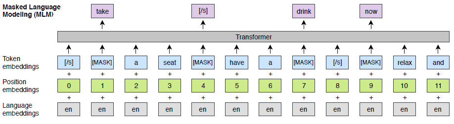 提出了 Translation Language Modeling (TLM)训练任务,将平行文本以 [eos] 分隔符分隔进行拼接,作为一条训练数据。XLM 使用 Masked Language Modeling(MLM)任务与 TLM 任务交替训练。