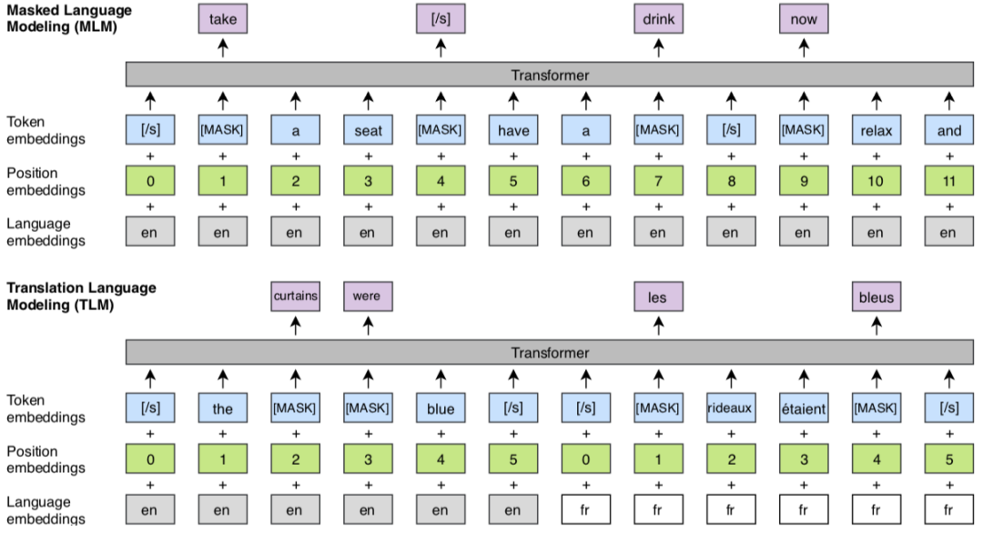 2. 改良了基于单语种语料的无监督学习 MLM 和提出了新的基于跨语言的平行语料的有监督学习方法 TLM。