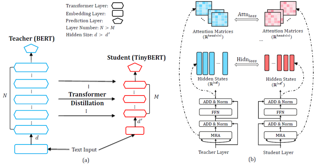 TinyBERT 提出了从 transformer 的具体组件蒸馏,包括 embedding 层;transformer 的隐层和 attention 矩阵;预测层的 logits,总体的损失函数是相应的 4 部分。预测层 logits 的 loss 定义为 teacher 的 logits 与 student 的 logits 的 soft cross-entropy loss,其他 3 个 loss 是 teacher 与 student 相应组件的 MSE loss。