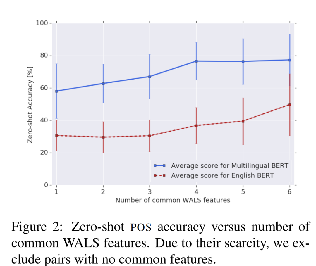 图 2 展示了多语言 BERT 在零样本迁移学习上 POS 任务的准确率与 WALS 特征数量的对比图。我们可以看到,准确率会随着语言相似度的提升而提升,这证明多语言 BERT 对具有相似特征的语言的迁移学习更加友好。