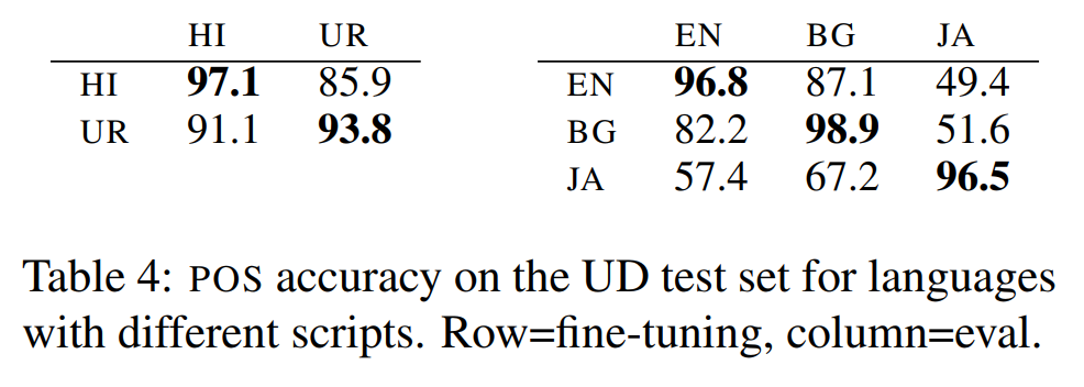 在 table4 中,我们可以看到,多语言 BERT 在只有阿拉伯文(UR)的数据集上进行 POS 任务的微调,在只有梵文(HI)上的数据集进行测试,仍然达到了 91% 的准确率,这是令人非常惊讶的,这表明多语言 BERT 拥有强大的多语言表征能力。