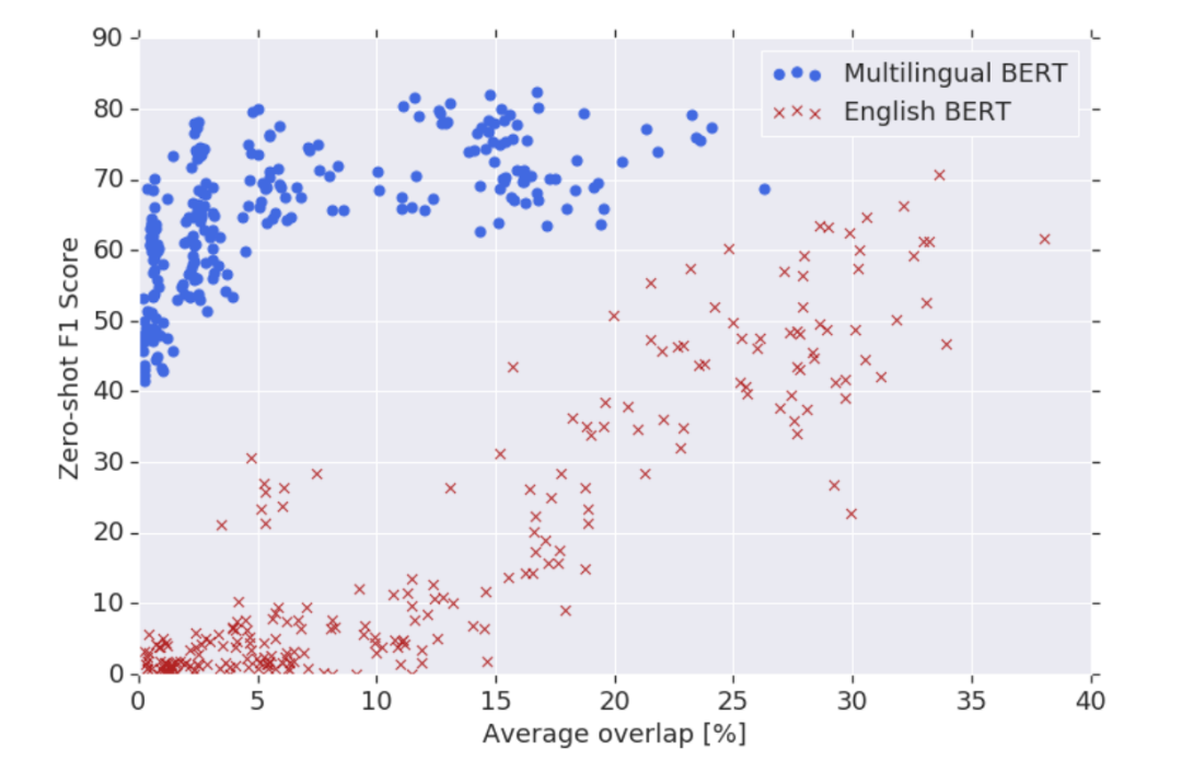 从上图看(横坐标是通过上面公式计算,纵坐标是 F1 值),我们可以看到 English BERT 的性能表现非常依赖于词汇重叠,迁移学习的能力会随着重叠率的下降而逐渐下降,甚至在完全不同的语言文本中(即重叠率为 0)出现 F1 分数为 0 的情况。