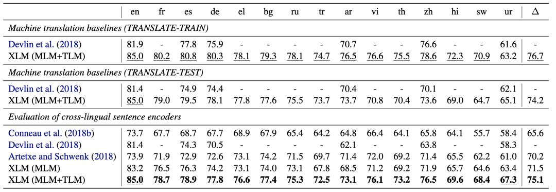 ▲ Resultson cross-lingual classification accuracy. Test accuracy on the 15 XNLIlanguages.