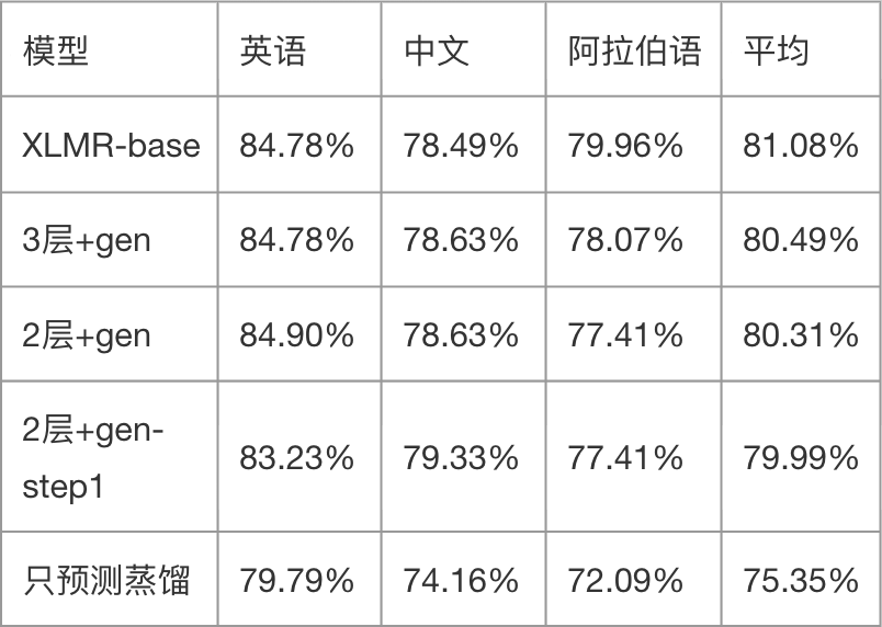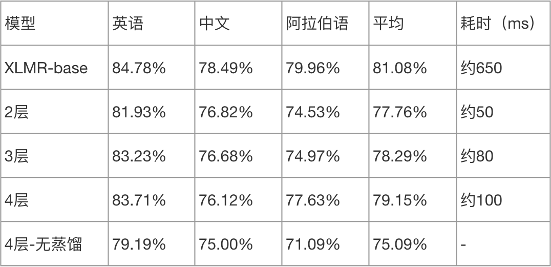 实验结果如下表,蒸馏的4层模型效果最好,平均准确率只比 XLMR-base 降低了 1.93%,2、3 层的模型效果较差。从耗时上看,4 层小模型的耗时较高,2 层最低。所有蒸馏模型效果都优于没使用蒸馏、直接随机初始化然后训练的模型(4 层-无蒸馏)。