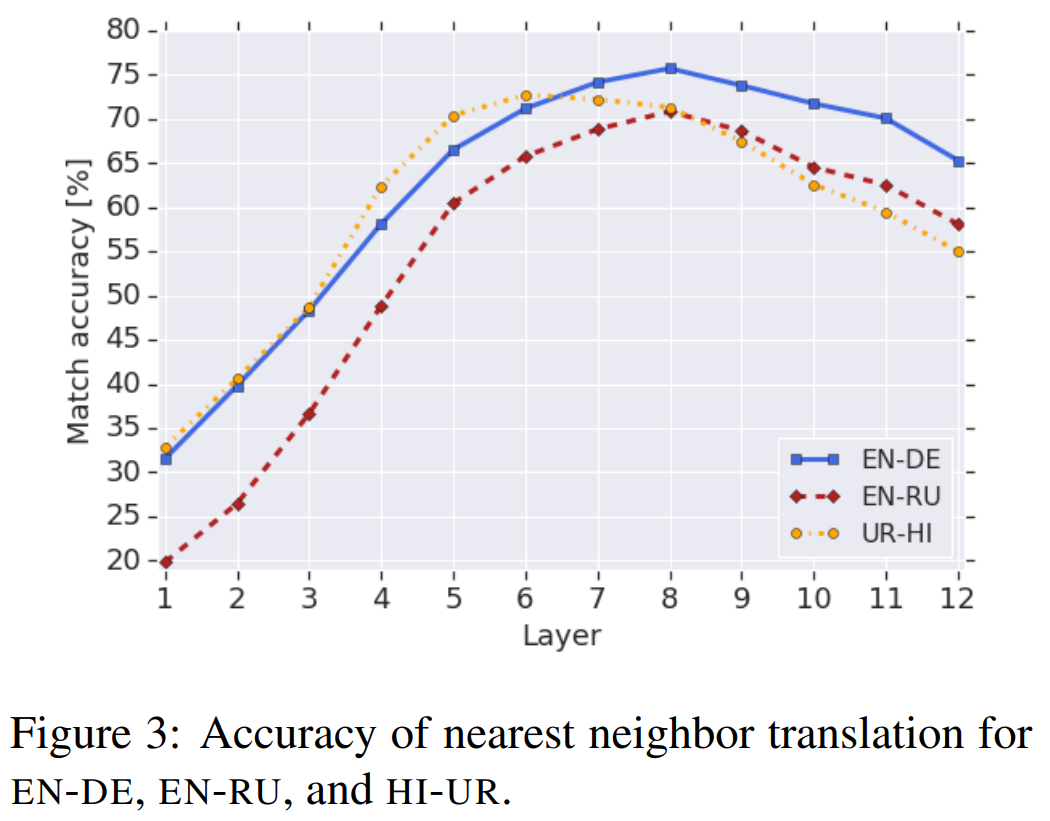 如图 3 所示,该图是翻译任务上的最近邻准确度在 BERT 每一层网络上的结果。我们可以看到,在 BERT 的非底层网络都实现了较高的准确率,这说明多语言 BERT 可能一种语言无关的方式,在大多数隐藏层共享语言特征表示。至于为什么在最后几层网络上准确率又下降了,论文提到:BERT 在预训练的时候可能需要添加与语言相关的信息。