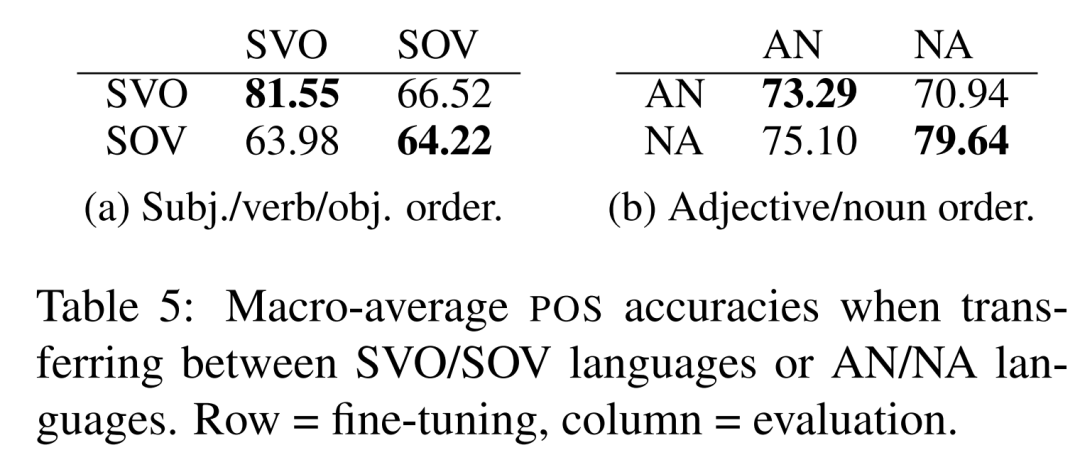 table 5 展示了在 POS 任务上进行的跨语言迁移学习的宏平均准确率与语言类型特征的对比。我们可以看到性能表现最好的情况是语言类型特征一样(SVO 和 SVO,SOV 和 SOV,AN 和 AN 以及 NA 和 NA)的迁移学习,这表明虽然多语言BERT能够学习到一定的多语言表征,但是似乎没有学习到这些语言类型结构的系统转换去适应带有不同语言顺序的目标语言。