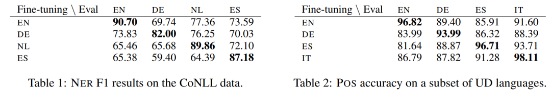 首先作者通过 NER 和 POS 任务进行跨语言迁移学习实验来验证 MBERT 的跨语言能力。