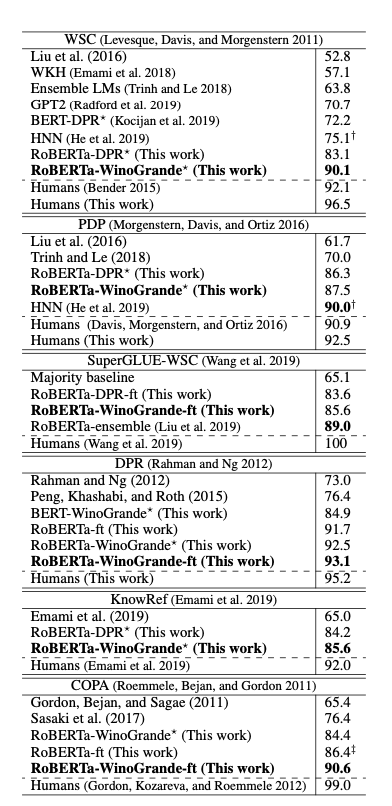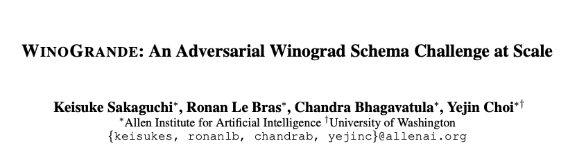 论文:WinoGrande: An Adversarial Winograd Schema Challenge at Scale论文地址:https://arxiv.org/abs/1907.10641 The Winograd Schema Challenge (WSC) 是一个人类常识推理的基准,其本身包含由273个专家设计的问题,这些问题无法用选择偏好或者单词关联的统计模型解决。最近的一些神经语言模型方面的工作已经在WSC以及相关的基准测试中达到了90%的准确率。但是这些模型是否稳健?是否高估了机器常识的真实能力?为了研究此类问题,作者引入了WinoGrande测试集,一个包含44000个问题的大规模数据集。受最初的WSC设计的启发,为了提高数据集的效率,进行了调整。数据集调整的关键步骤包括:1.精心设计的众包问题;2.使用AFLITE 算法减少系统偏差,该算法可以将自然语言转化为机器可以处理的向量。WinoGrande上最好的方法达到59.4-79.1%的准确率,比人类的94.0%低15-35%,当然,这也取决于允许的训练数据量。此外,作者也在WSC(90.1%)、DPR(93.1%)、COPA(90.6%)、KnowRef(85.6%)和Wingender(97.1%)这五个相关基准上进行了新的测试。测试结果表明:1、WinoGrande作为迁移学习资源是有效的;2、我们高估了基准测试中机器常识的真实能力。