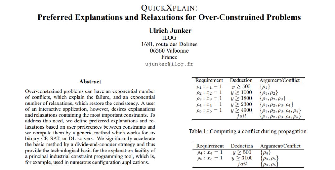 2020年AAAI经典论文奖被授予发表在2004年第十九届 AAAI (在美国加州圣何塞举行)上的被认为最具影响力的论文,如下: 论文:QUICKXPLAIN: Preferred Explanations and Relaxations for Over-Constrained Problems 获奖理由:针对过约束问题开发了一个可用于形式化和有效计算的有影响力的方法,是用户用来解释故障的首选方法。摘要:过约束问题包括造成故障的指数级冲突问题和修复一致性的指数级松弛问题。然而,交互应用程序的用户希望获得故障解释和松弛能够涵盖最重要的约束。 为了满足这一需求,作者基于用户在约束之间的偏好,定义了偏好的解释和松弛,并且通过使用适用于任意CP、SAT或DL解算器的泛化方法来计算解释和松弛。作者通过分而治之的策略极大地对基本方法进行了加速,因而为例如在很多配置应用中使用的基础工业约束编程工具的解释能力,提供了技术基础。