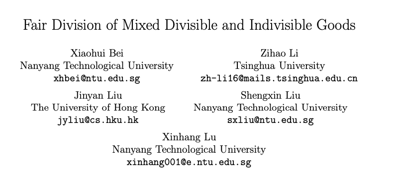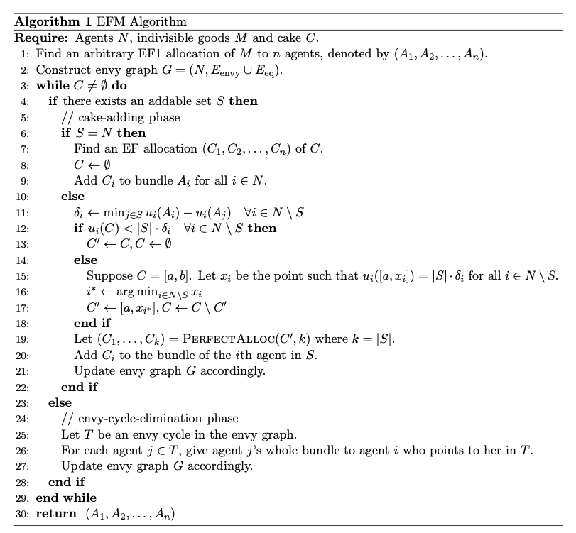 论文:Fair Division of Mixed Divisible and Indivisible Goods论文地址:https://arxiv.org/abs/1911.07048v1摘要:本论文中,作者研究了在资源同时包含可分割商品和不可分割商品时的公平分配问题。经验的公平性概念如无嫉妒性(Envy-Freeness,EF)和最多有一种商品无嫉妒性(Envy-Freeness Up to One Good,EF1),无法直接应用到这种混合性的商品场景中。在本论文中,作者提出了一种新的公平性概念:针对混合商品的无嫉妒性(Envy-Freeness for Mixed Goods ,EFM),能够直接将EF和EF1 泛化到混合商品场景中。同时,作者还证明了对于任意数量的代理,都存在EFM 分配。同时,作者还提出了一种有效的算法,可在可分割商品上采用分段线性估值计算两个代理甚至 n个代理的 EFM 分配。最终,他们放宽了无嫉妒性需求,而是要求混合商品具有ǫ-无嫉妒性(ǫ-EFM),并且还提出了能够在一定数量的代理、一定数量的不可分割商品以及和1 /ǫ下的时间多项式中找到ǫ-EFM分配的算法。
