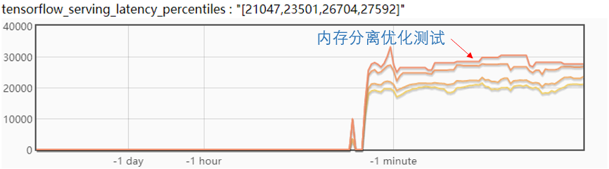 下面这张图是我们在 TF Serving 代码中增加了 Bvar(https://github.com/apache/incubator-brpc/blob/master/docs/cn/bvar.md) 来查看内部请求的延迟情况。图中是延迟的分位比,延迟分位值分别为 [p80, p90, p99, p999],单位是微秒。