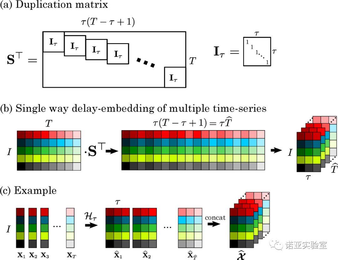 图4:图(a)展示的是MDT技术里的映射矩阵S(在MDT里称之为重复矩阵) ;(b)展示一个尺寸为I *T的 矩阵通过映射矩阵S 沿着时间维度T方向做变换,得到一个三维张量数据;(c)进一步展示图(b)的案例: