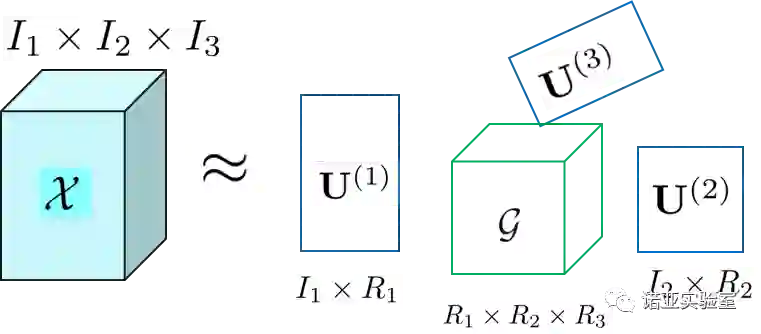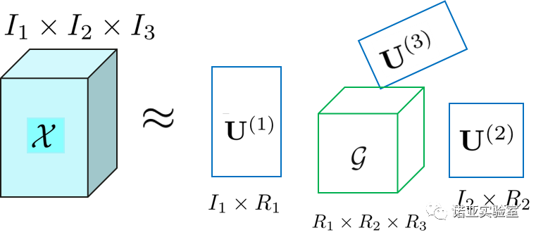 张量是多维数据的专有名词。向量和矩阵可分别被认为是一阶和二阶张量。在现实世界中,很多数据比如视频等都是以张量形式存在。张量分解是一种强大的计算技术,通过将原数据分解从中提取有价值的特征。Tucker 分解是其中一种非常常用的张量分解模型。对于一个三阶张量, 由Tucker分解可以得到三个二阶的因子矩阵(factor matrix)和一个三阶的核张量(core tenor)。换句话说:Tucker 分解通过因子矩阵(也称作映射矩阵)将原张量映射到一个具有良好特性(比如low-rank)的核张量。核张量可以进一步被应用于分类、聚类、回归等任务中。如图所示: