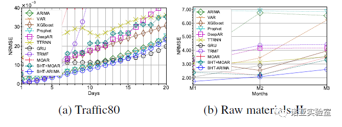 图7展示了长期预测结果的比较,进一步证实了BHT-ARIMA的良好性能。预测更多的步骤,所有方法的误差通常都会增加,而BHT-ARIMA始终在整体上保持其最佳性能,尤其是在较短的Raw materials 数据集上。虽然在Traffic80数据集上进行15步预测后,GRU的性能略胜于我们的方法,但它的计算时间是BHT-ARIMA的近900倍。