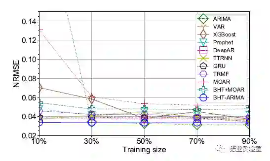 我们通过对比不同长度和样本数目的时间序列,结果以误差NRMSE衡量预测准确率。