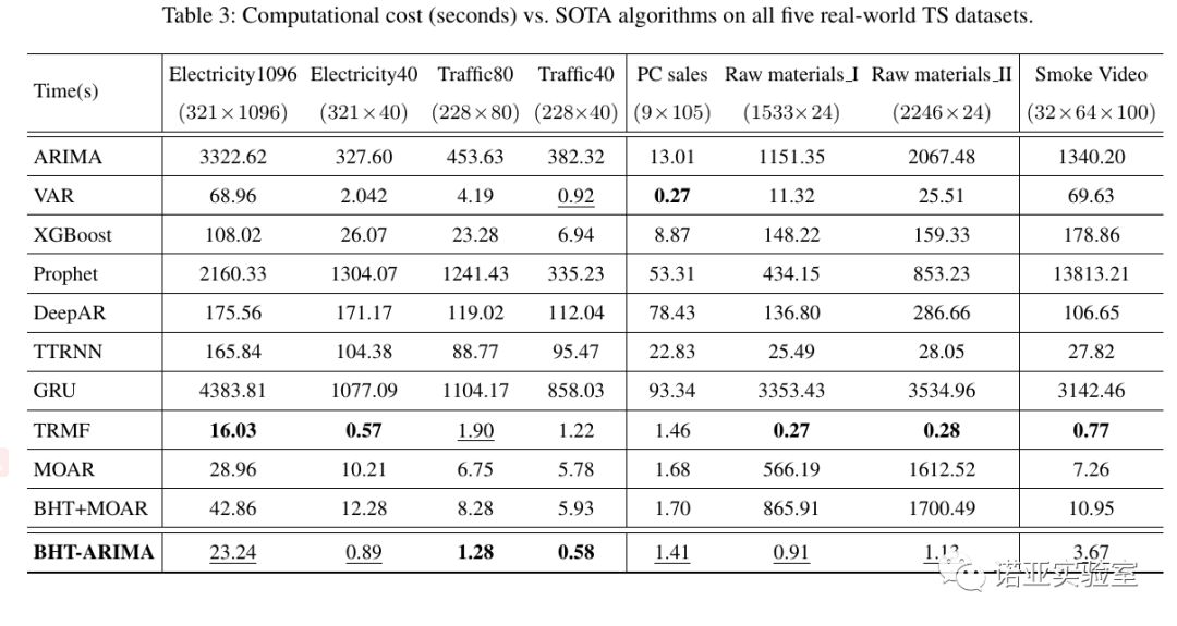 最后,我们对比所有方法的训练时间,如Table 3 所示。整体来说,BHT-ARIMA是运行第二快的算法——我们主要关注准确性因而暂未针对效率优化代码。尽管TRMF在某些情况下比VAR慢一些,但由于其核心部分是由C语言编程实现的,因此它总体上是最快的。虽然在一些测试中GRU和ARIMA的预测结果排列第二甚至超BHT-ARIMA,但它们是最慢的方法(平均比我们的算法慢500倍以上)。