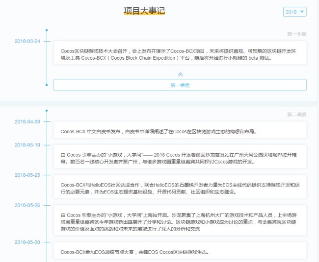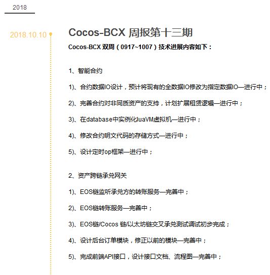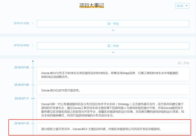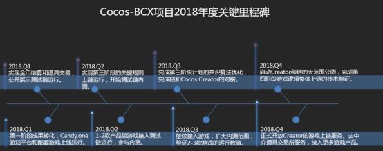 依据项目官方网站信息披露,大事记显示2018年第三季度Cocos-BCX主链已经启动了内测。基于项目技术模块的明显特征,Cocos-BCX推出了系统级和功能性两大系列产品,其中包含多种操作与多环境的开发框架、铁匠铺机制等。