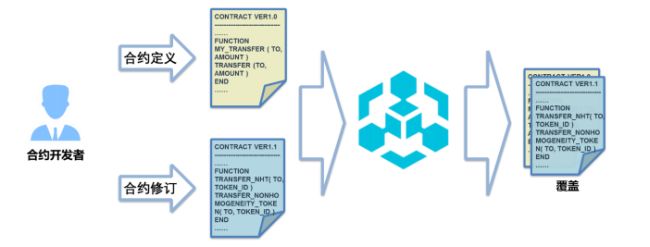 具体运行过程为:当合约开发者将定义的合约发布至链网络后,系统允许具备此合约开发者权限的用户使用修改后的合约更新此合约,虽然旧的合约仍然存在(确保合约的公开和公正性),但链上的合约地址的内容将被新的合约数据覆盖,多合约应用无需更新引用关系。