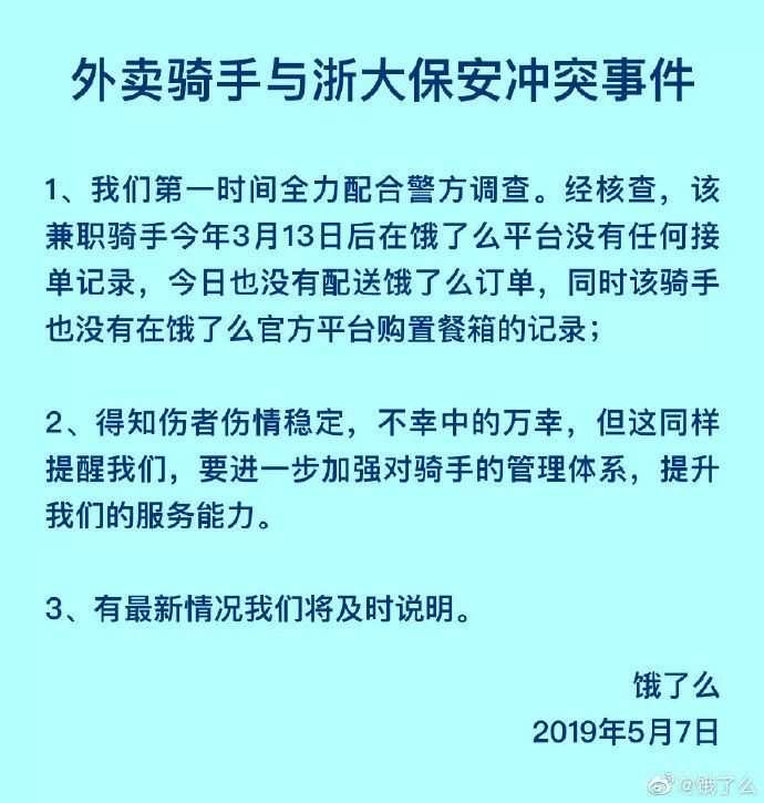 2.饿了么回应骑手与浙大保安冲突事件:是兼职,近两月没有接单记录
